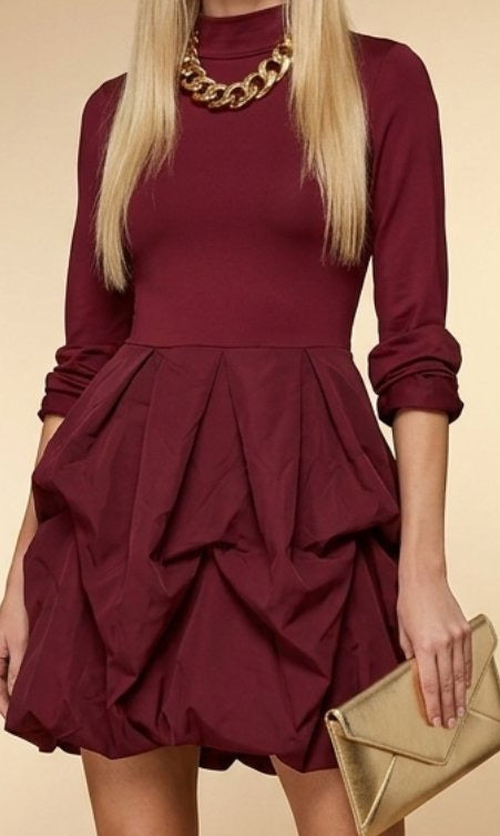 BORDEAUX BUBBLE | Mini Dress with Mock Neck & Long Sleeves