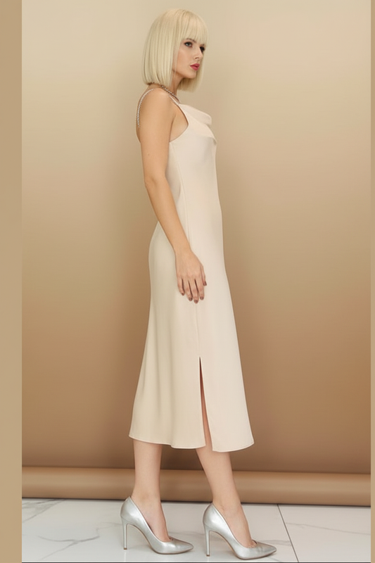 BEIGE SATIN MIDI DRESS | Beige Satin Midi with Straps & Drapé Size L