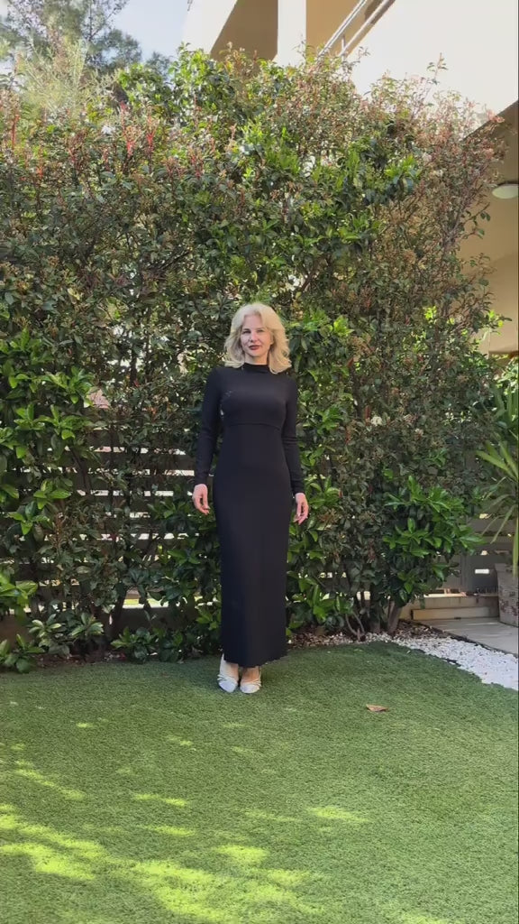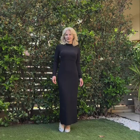Ένα μοναδικό μαύρο φόρεμα με πέτρες μαύρες γυαλιστερές με ψηλό γιακά κλειστό από την μπροστινή πλευρά και από την πίσω πλευρά έχει μια υπέροχη πλάτη φοβερή εφαρμογή φανταστική ποιότητα μακρύ μανίκι μακρύ φόρεμα κουμπώνει πίσω στο λαιμό