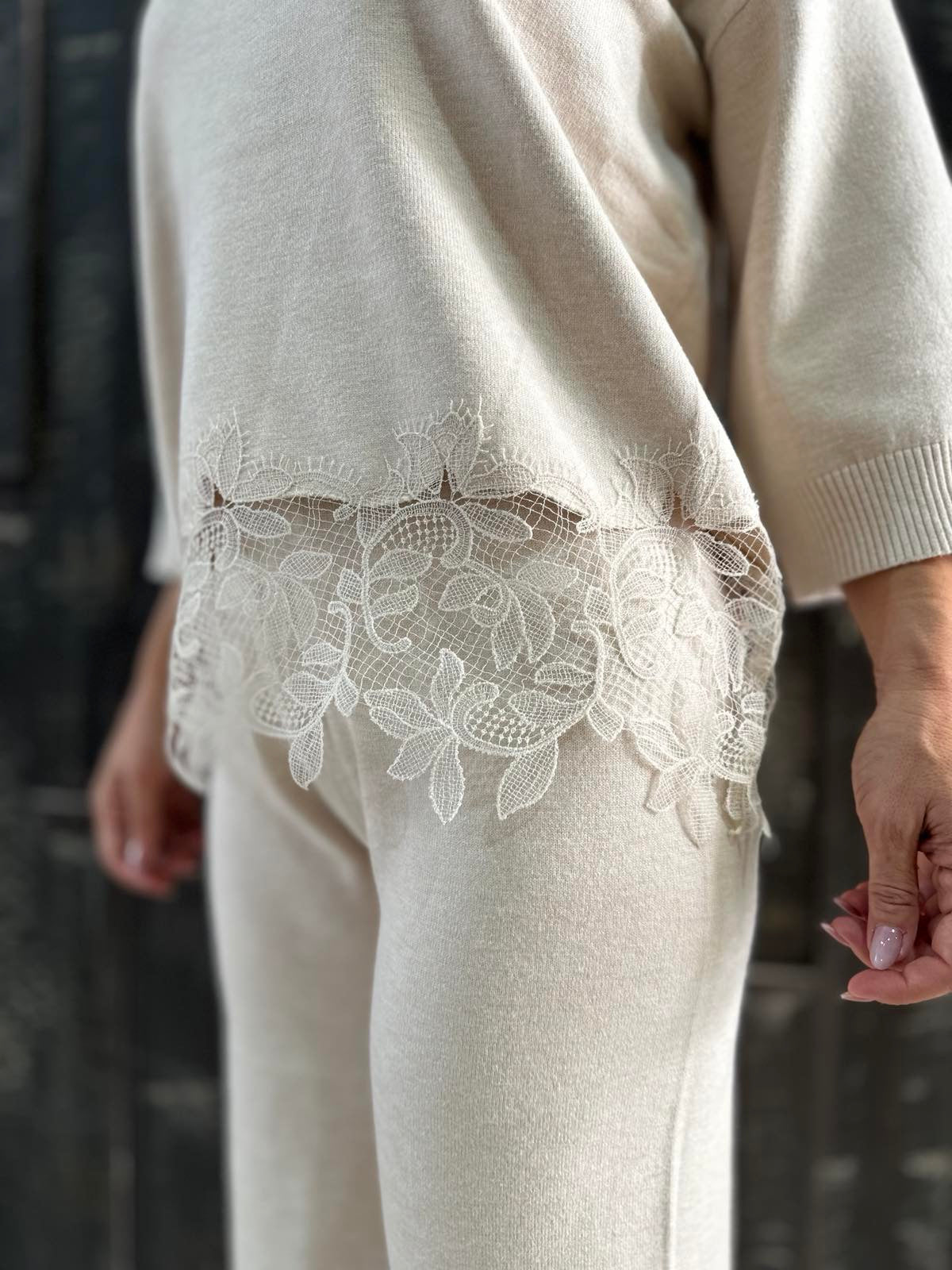 Μπεζ σετ με δαντέλα – λεπτομέρειες στο κάτω μέρος της μπλούζας και στο κάτω μέρος του παντελονιού για θηλυκό και κομψό look.