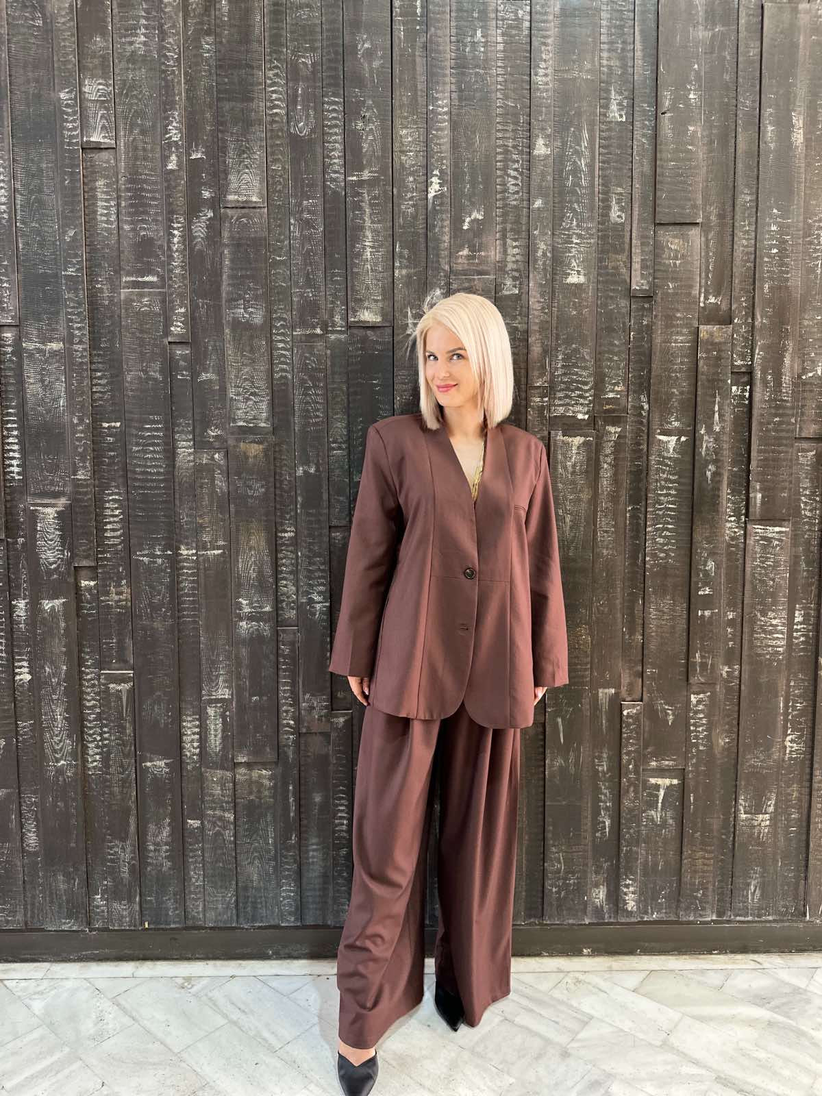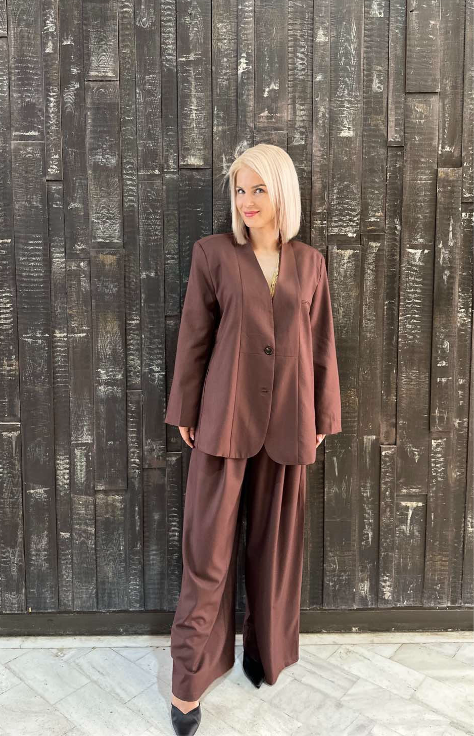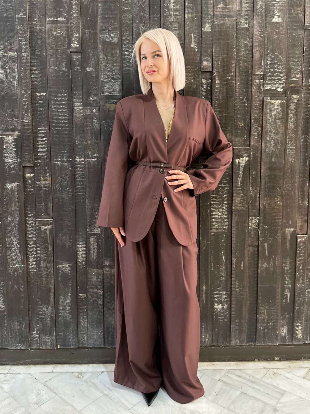 Καφέ σετ με παντελόνι και oversized σακάκι με ριγέ επένδυση – μοντέρνο, κομψό και ιδανικό για δυναμικές εμφανίσεις.