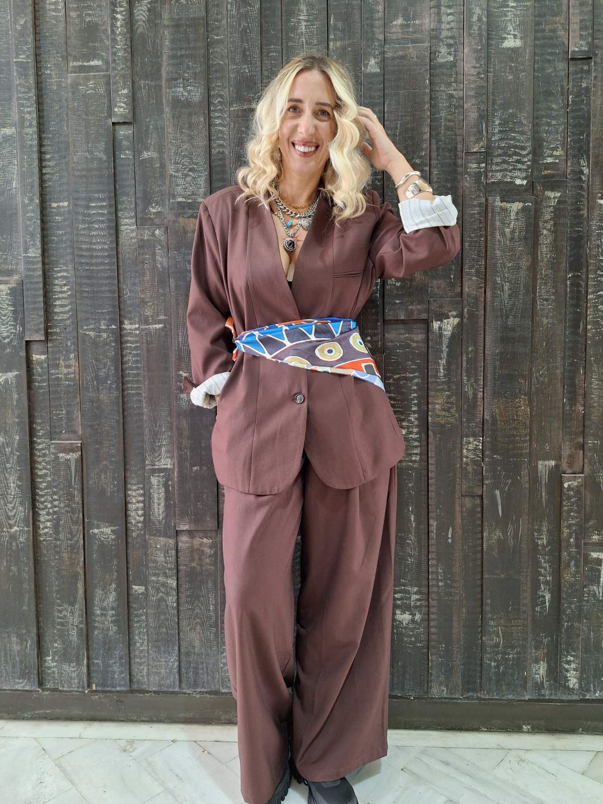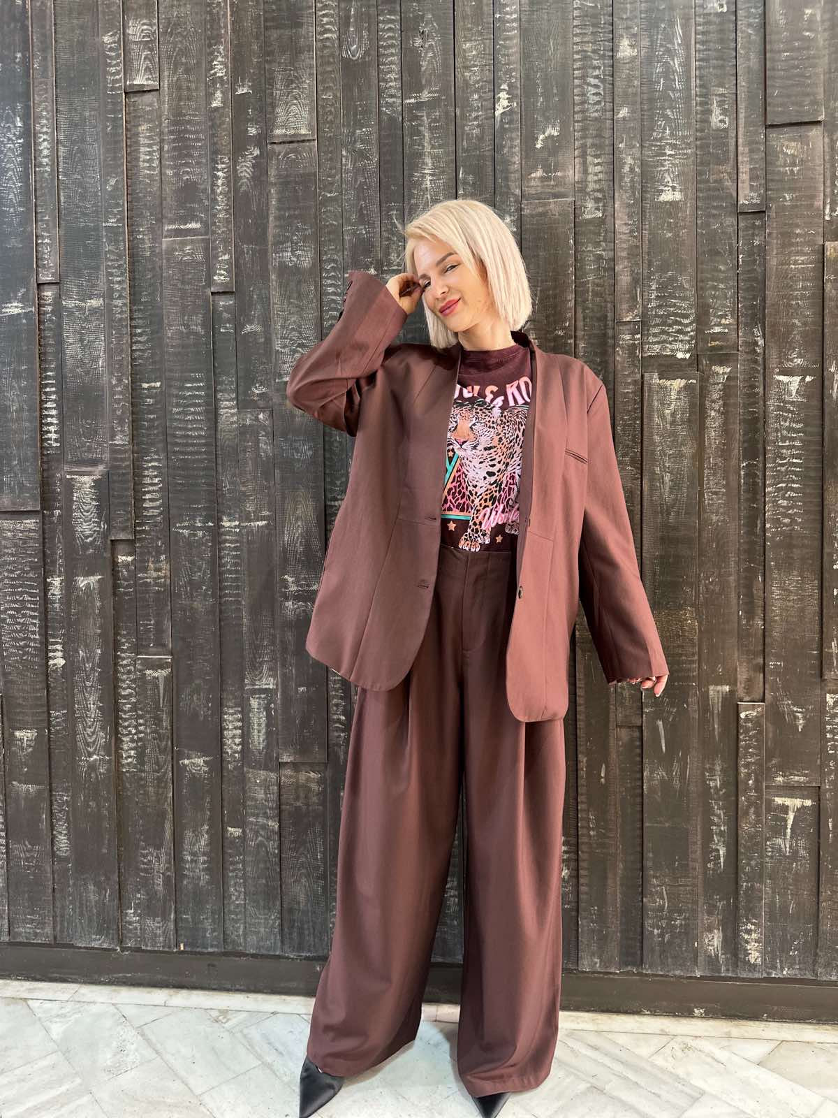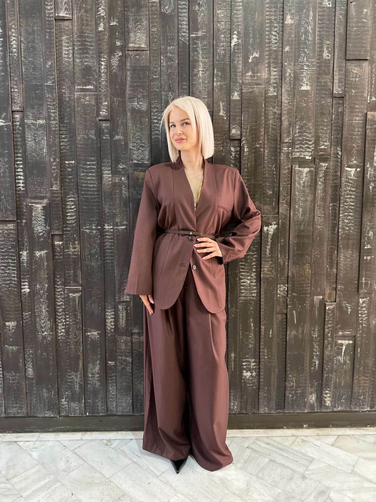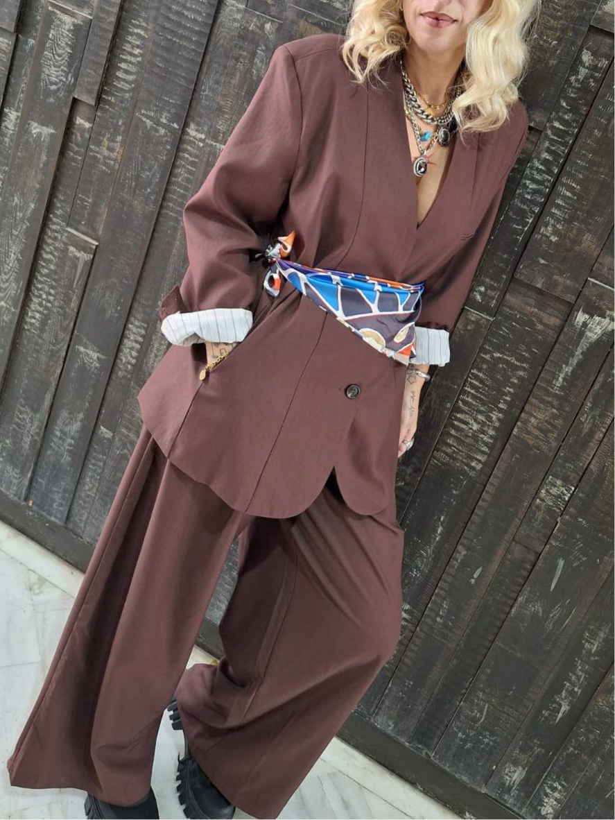 Καφέ σετ με παντελόνι και oversized σακάκι με ριγέ επένδυση – μοντέρνο, κομψό και ιδανικό για δυναμικές εμφανίσεις.