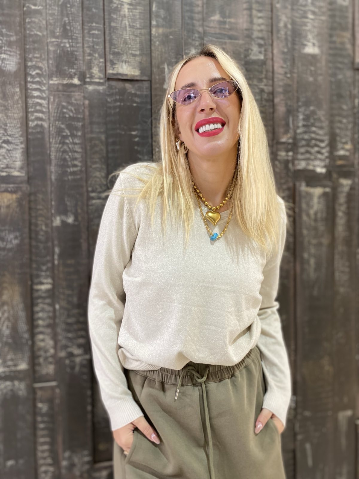 One size μπεζ μπλούζα που λαμπυρίζει διακριτικά να έχει απαλό γκλίτερ, χαρίζοντας κομψότητα και θηλυκότητα.