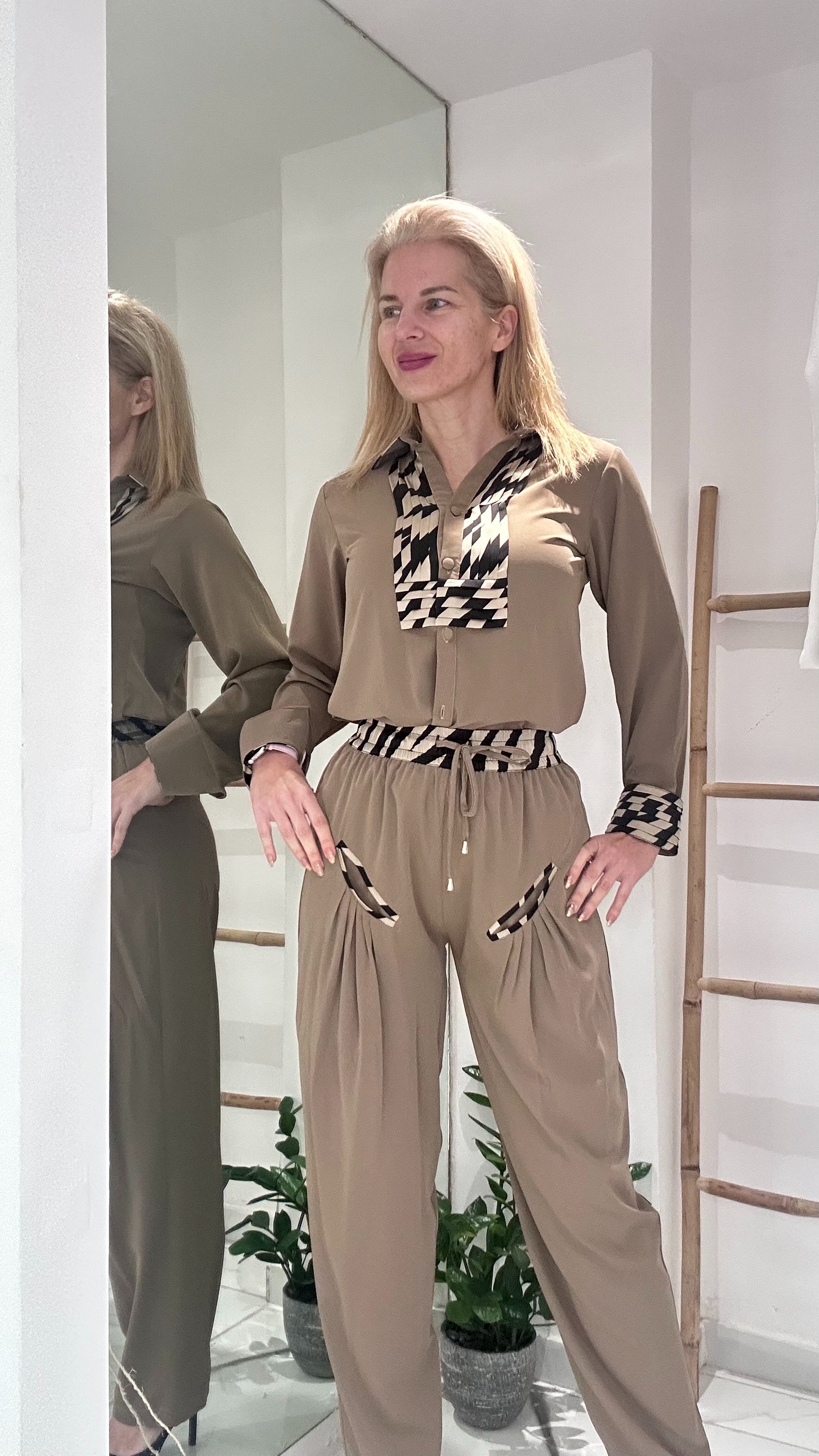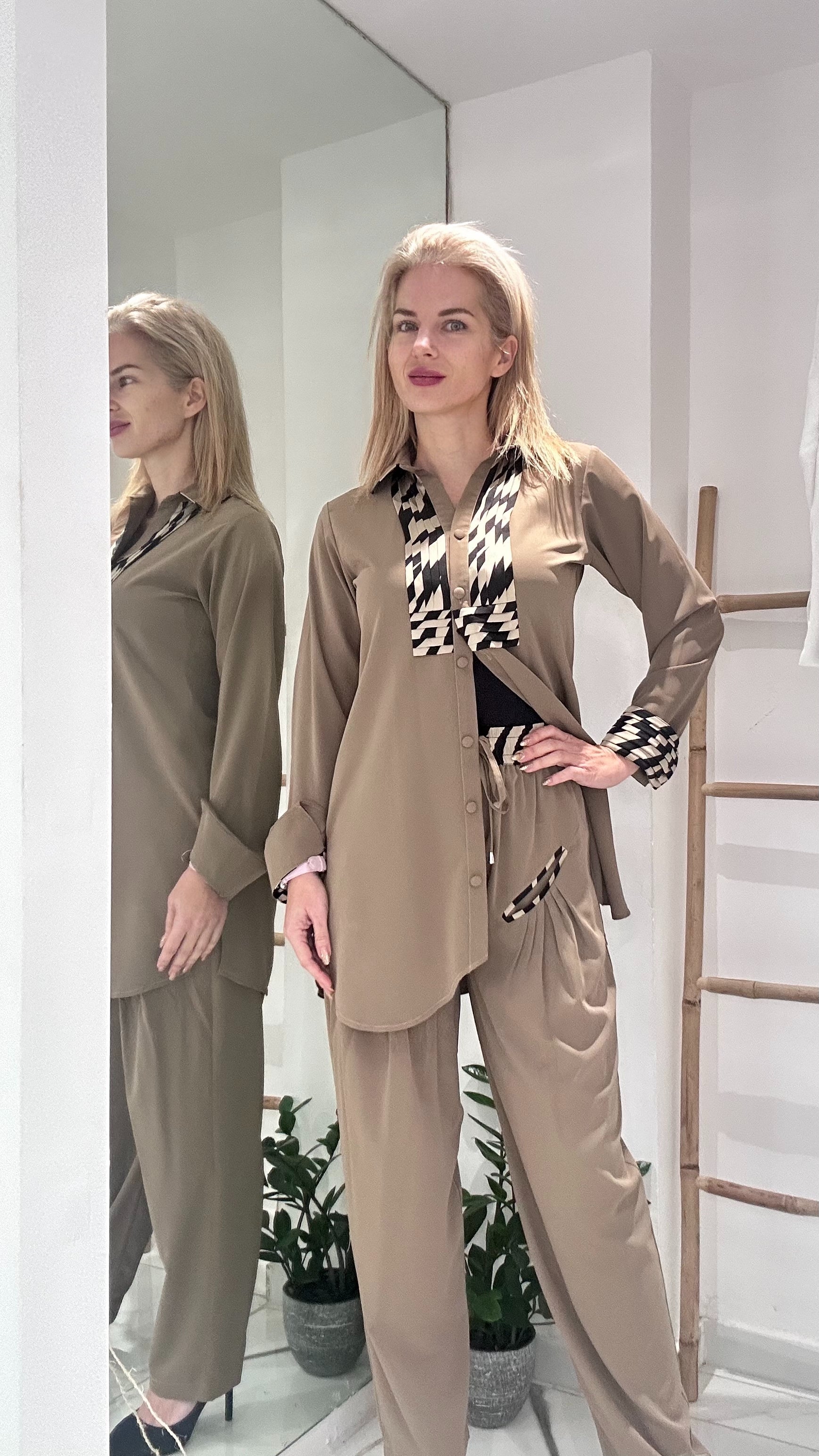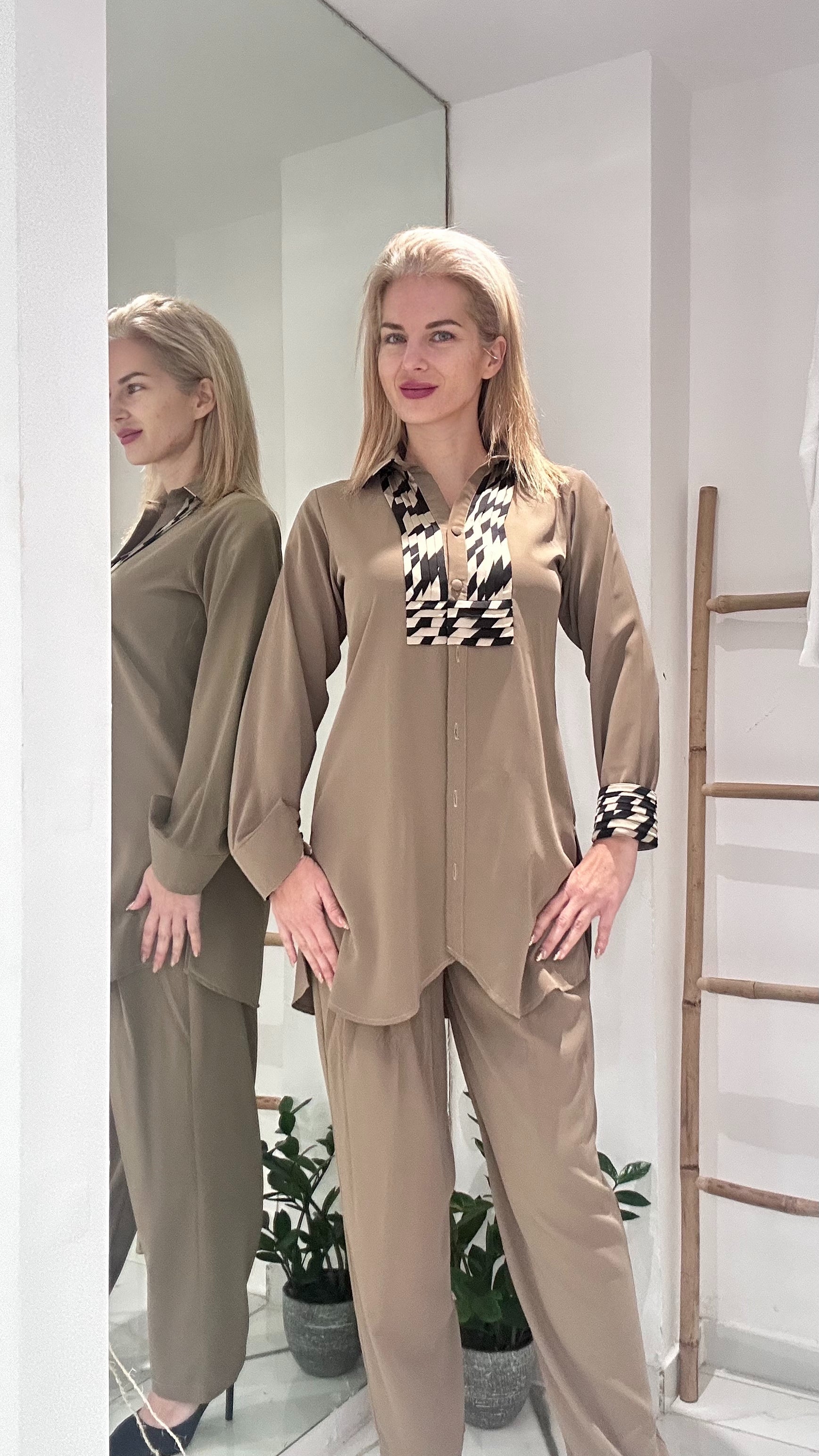 Top στο χρώμα του πούρου που αποτελείται από πουκάμισο μακρύ με ασπρόμαυρες λεπτομέρειες