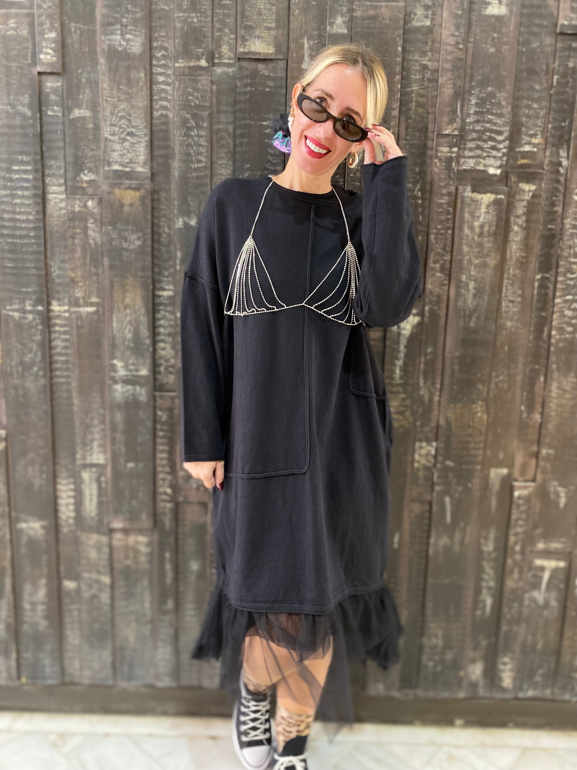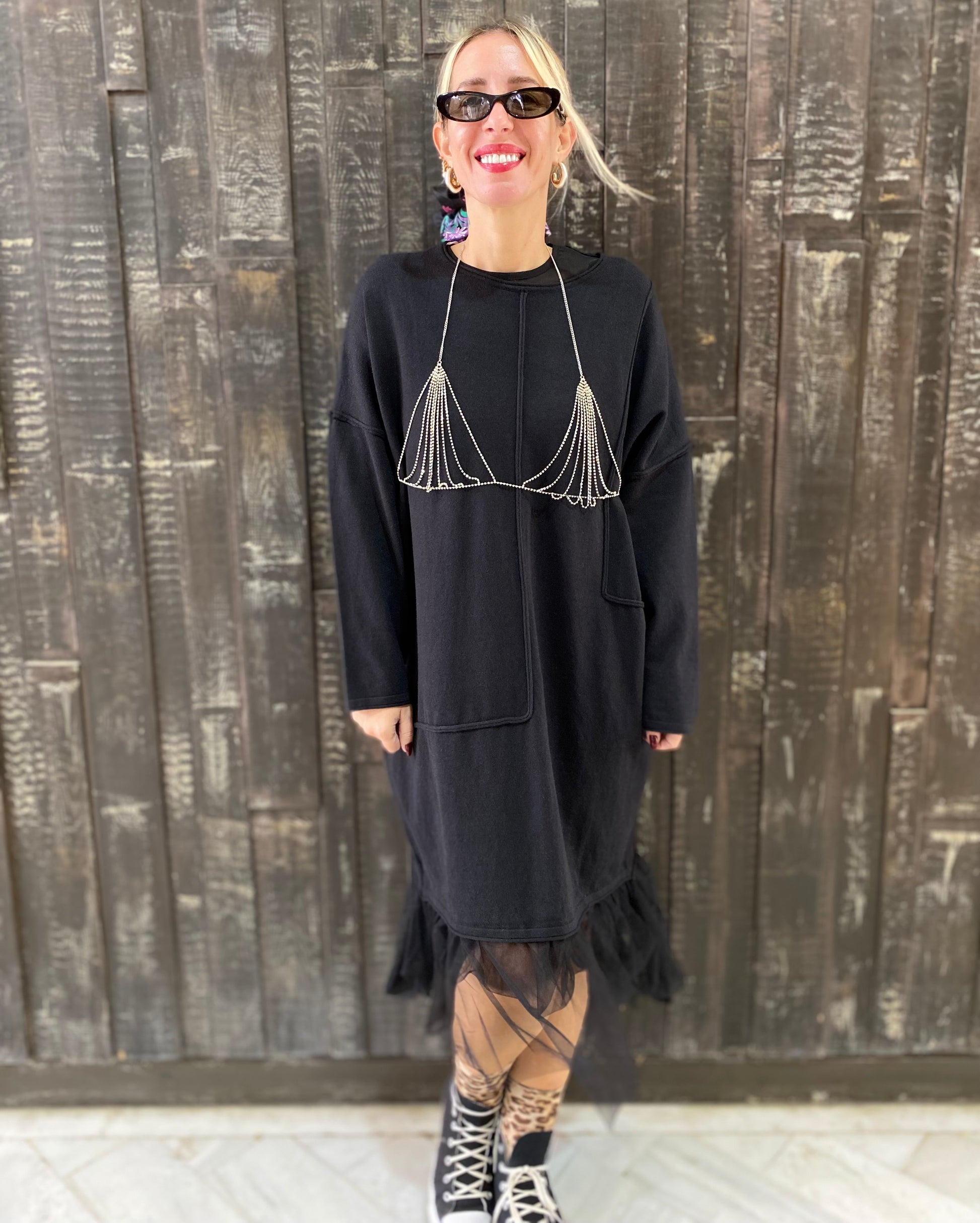 Μαύρο μακρυμάνικο midi one size φόρεμα με τούλι στο τελείωμα – κομψό και θηλυκό, με αέρινο τούλι που προσθέτει μια μοντέρνα νότα σε κάθε εμφάνιση. Ιδανικό για επίσημες ή βραδινές εμφανίσεις.
