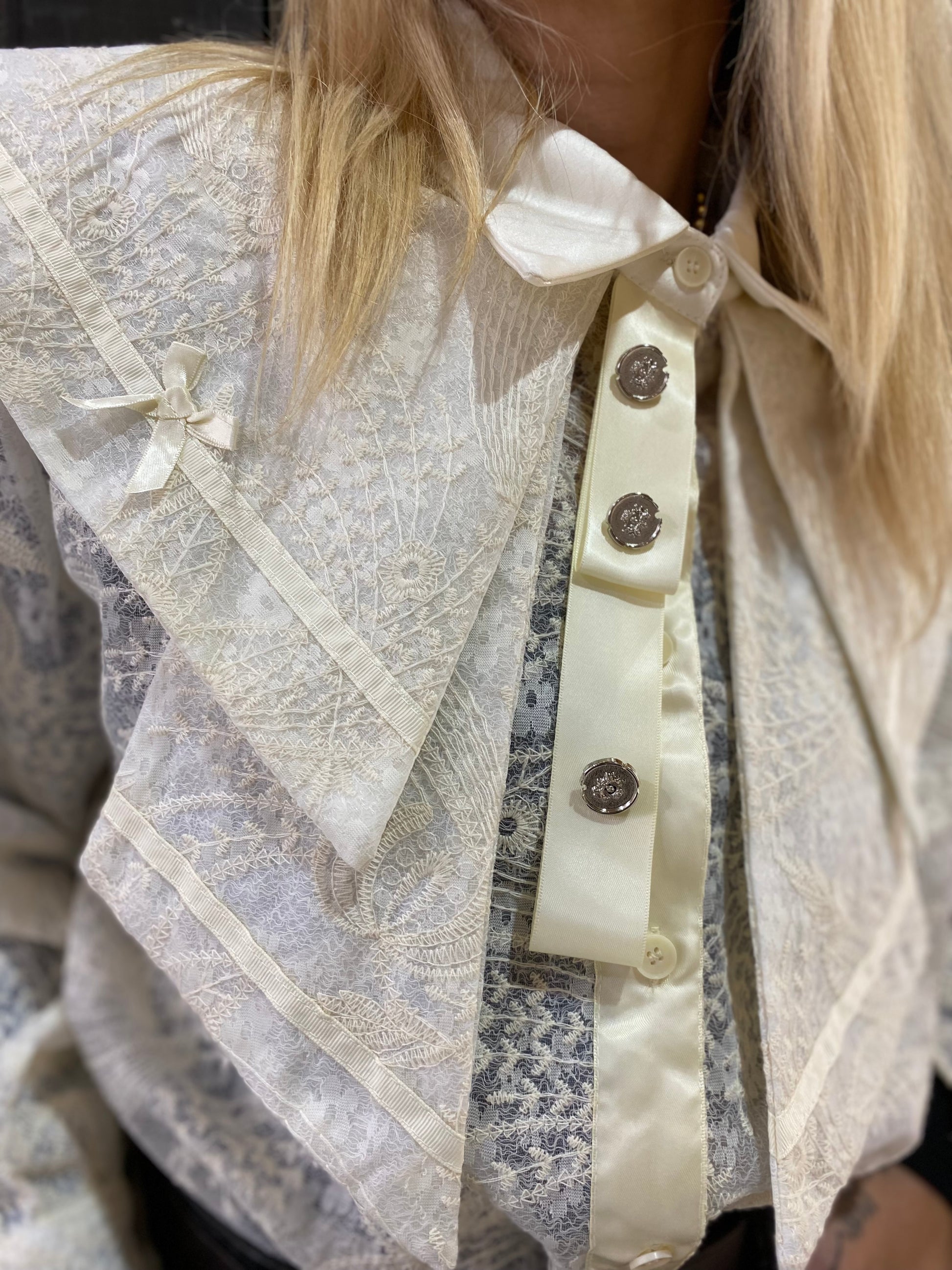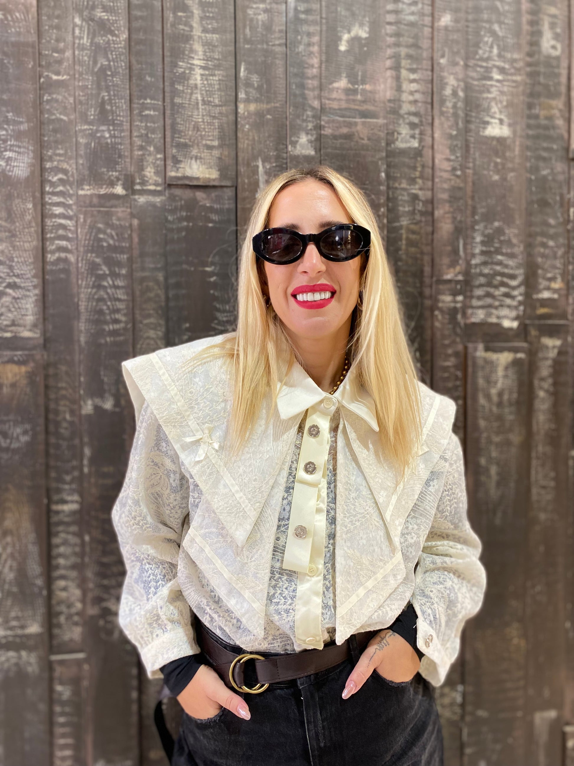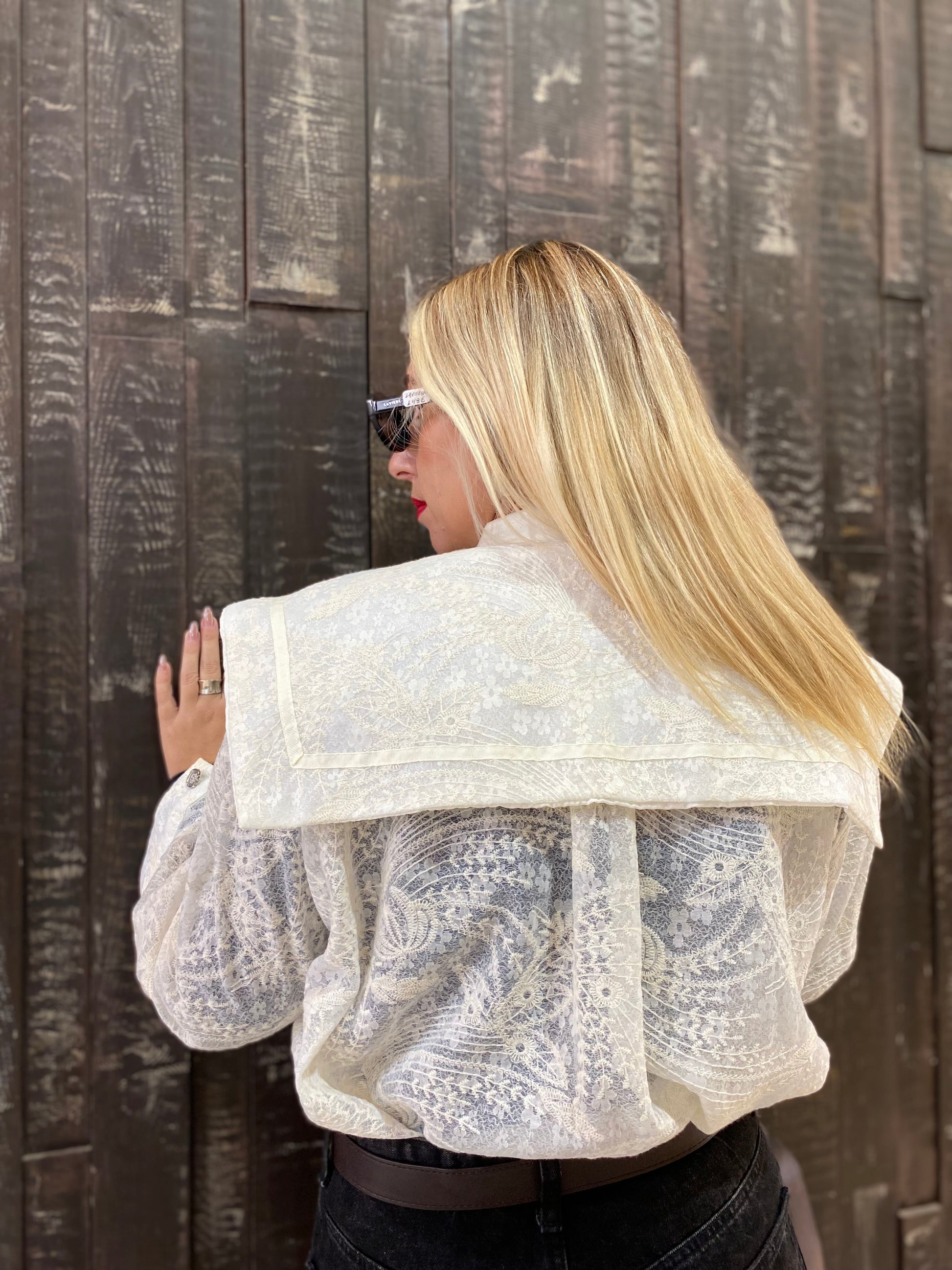 One size λευκό πουκάμισο από δαντέλα, με απαλή υφή και κομψή διάθεση. Ιδανικό για σικάτες εμφανίσεις, συνδυάζεται εύκολα τόσο με παντελόνι όσο και με φούστα, χαρίζοντας θηλυκότητα και διαχρονικό στυλ.