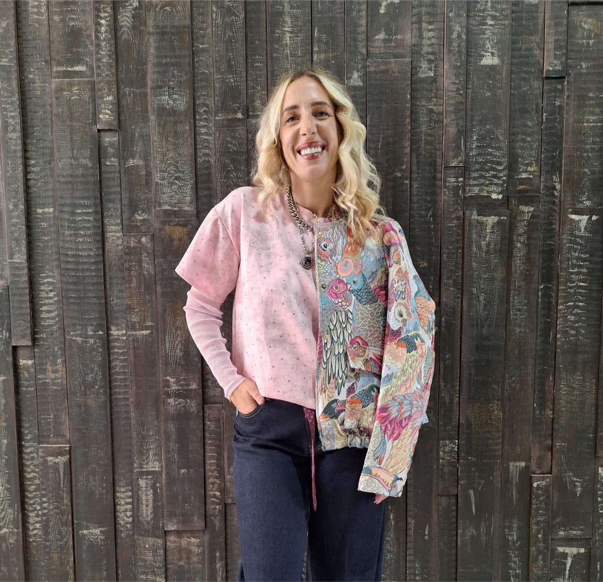 One size ροζ κοντομάνικο μπλουζάκι με λαμπερά στρας και αέρινα μανίκια από σιφόν, που συνδυάζει κομψότητα με θηλυκή φινέτσα.